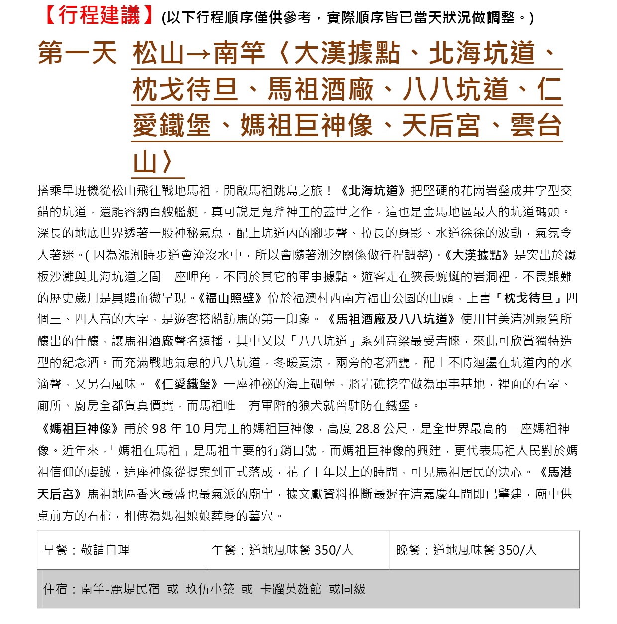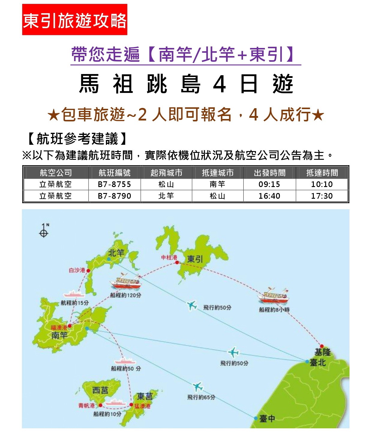 松山出發 → 馬祖4天包車遊~4人同行優惠價$16900/人