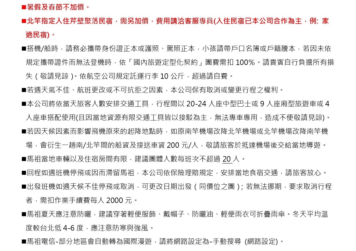 即日起112/03/20,配合夏令時段,本公司營業時間恢復為 週一至週五 上午9:00至下午18:00。 馬祖全攻略包車五日遊~4人成行 一生必去一次~ 馬祖戰地風光5天全攻略~帶您尋找藍眼淚~全國大散拼2人即可報名 韓國濟州島5日遊~$17500起/人 報名請洽04-22369292 中越峴港5日遊~$15800元起/人 報名請洽04-22369292 帶您尋找藍眼淚~馬祖包車3日遊$12900起 暢遊台灣度假券(卡)國內訂房資訊~請點選上客渡假聯盟網站~